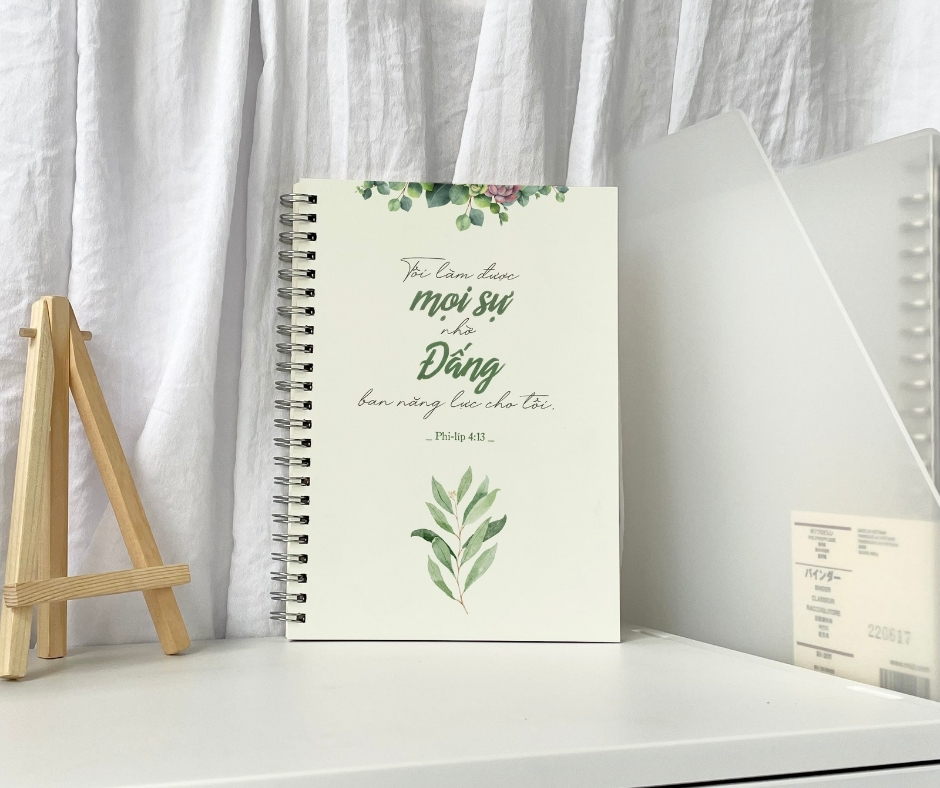 Sổ cơ đốc A6 gáy xoắn, 120 trang dòng kẻ, bìa trắng câu gốc Kinh Thánh Phi-Lip 4:13 "Tôi làm được mọi sự..."
